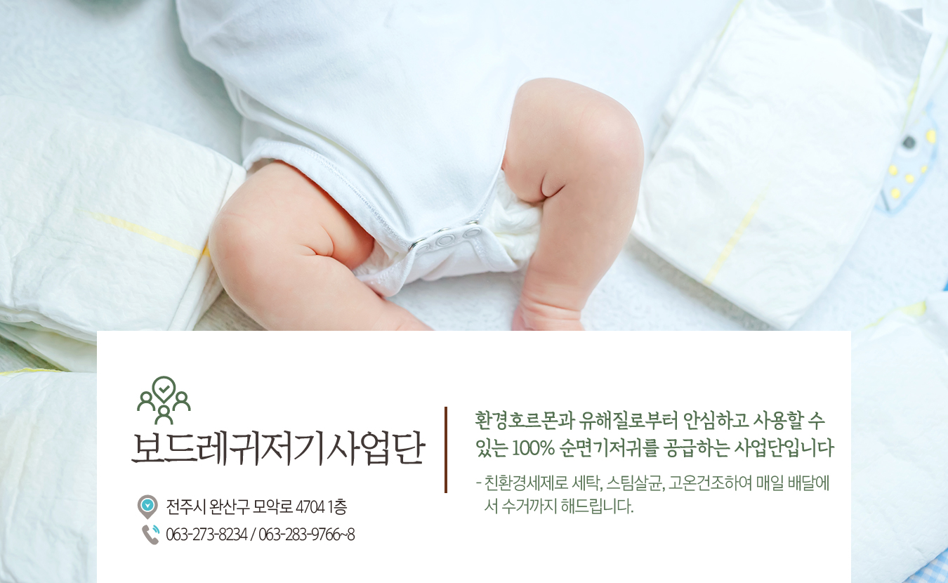 환경호르몬과 유해질로부터 안심하고 사용할 수 있는 100% 순면기저귀를 공급하는 사업단입니다. 친 환경세제로 세탁, 스팀살균, 고온건조하여 매일 배달에서 수거까지 해드립니다.