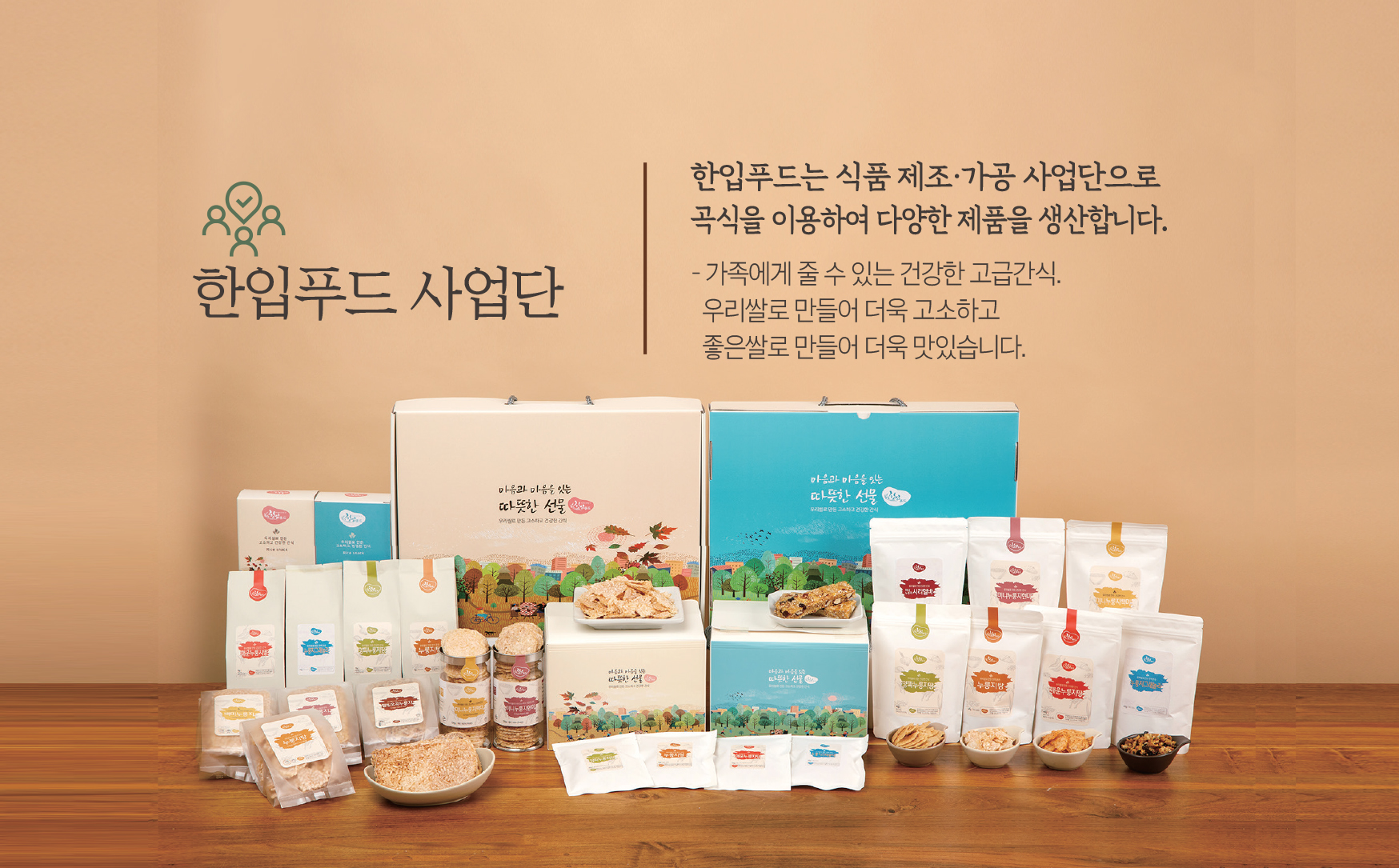 한입푸드는 식품 제조·가공 사업단으로 곡식을 이용하여 다양한 제품을 생산합니다.